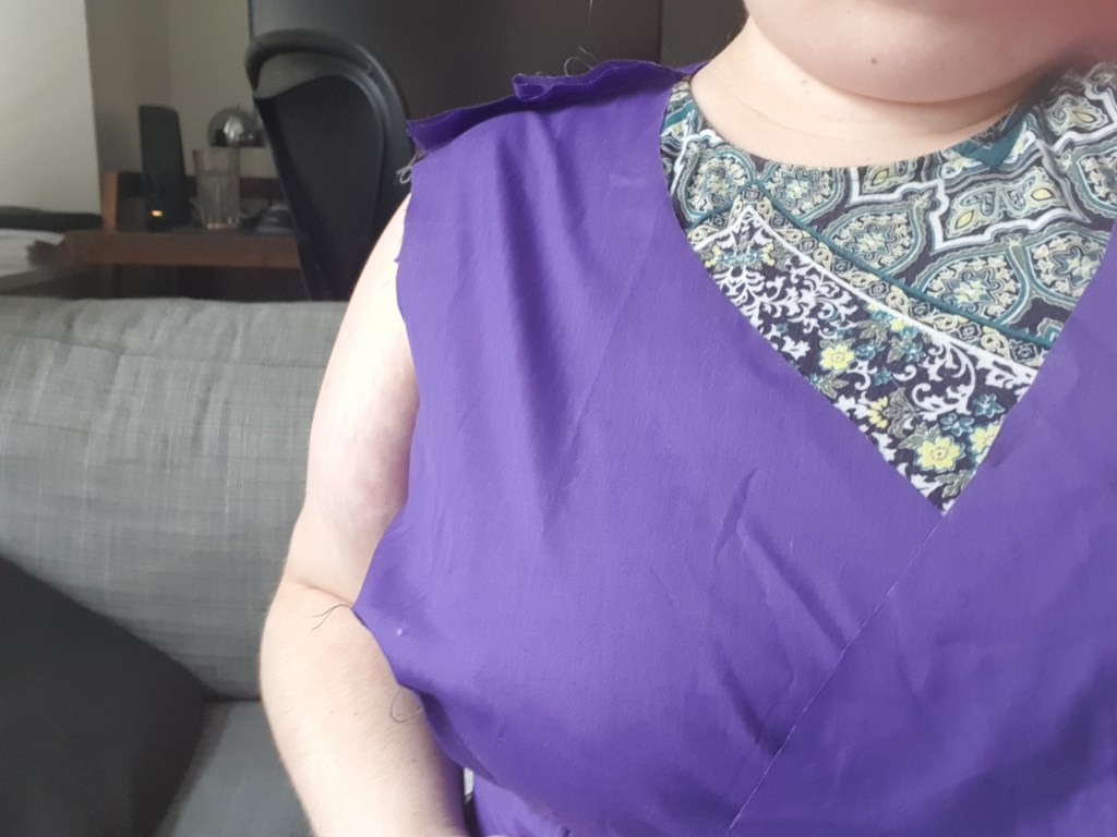 You can see the bodice was too oversized, as were the sleeves. I’d also got the rouleau ties the wrong way round, so my front underlap was actually overlapping instead – when I replaced the bodice I took the time to fix this and I’m much happier with it. I also kept an eye on print placement, choosing to put the large flower in the center back and ensuring the print didn’t dominate the front bodice pieces or sleeves.