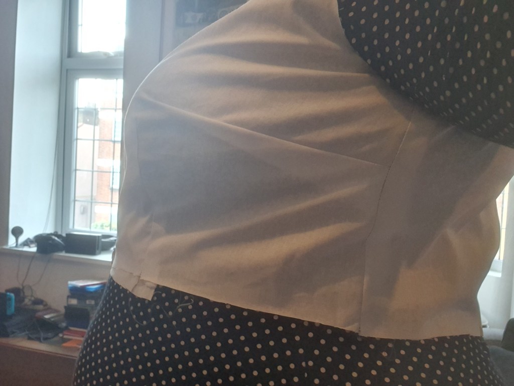 I knew if I did a size 20 I’d have to do an FBA. The difference between my full bust and high bust was 4″, so the guides I read suggested a 2″ adjustment. On top of this, I knew I had a broad back and would need to adjust for that, as the fit of the 24 bodice at the back was about right – no pulling. That meant I did a 4cm BBA (yes, I mix imperial and metric as needed!). I have a very broad back…! That led me to this toile of a size 20 bodice with 2″ FBA and 4cm BBA.