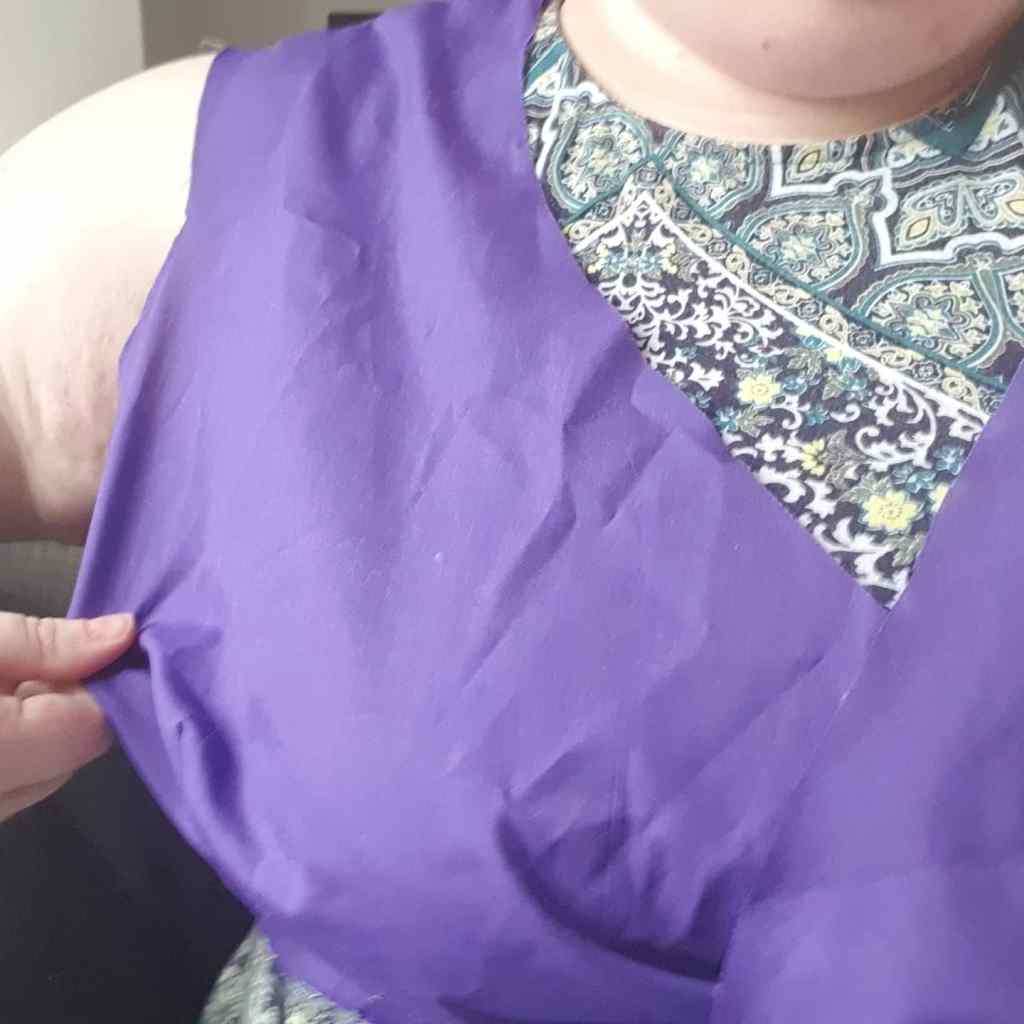 This fixed the neckline gape but left a sizeable pocket of excess fabric at the side of my bust. I asked around for help, as I had no idea what adjustment was necessary as I was a beginner, and got mixed responses (including a bigger FBA). Fortunately, I’m in an online sewing club run by the fantastic The Thrifty Stitcher and she identified that my FBA was actually too big and that I also needed a narrow shoulder adjustment, as the shoulders were too wide. So I reduced the FBA to 1″ and did a 1.5cm NSA.
