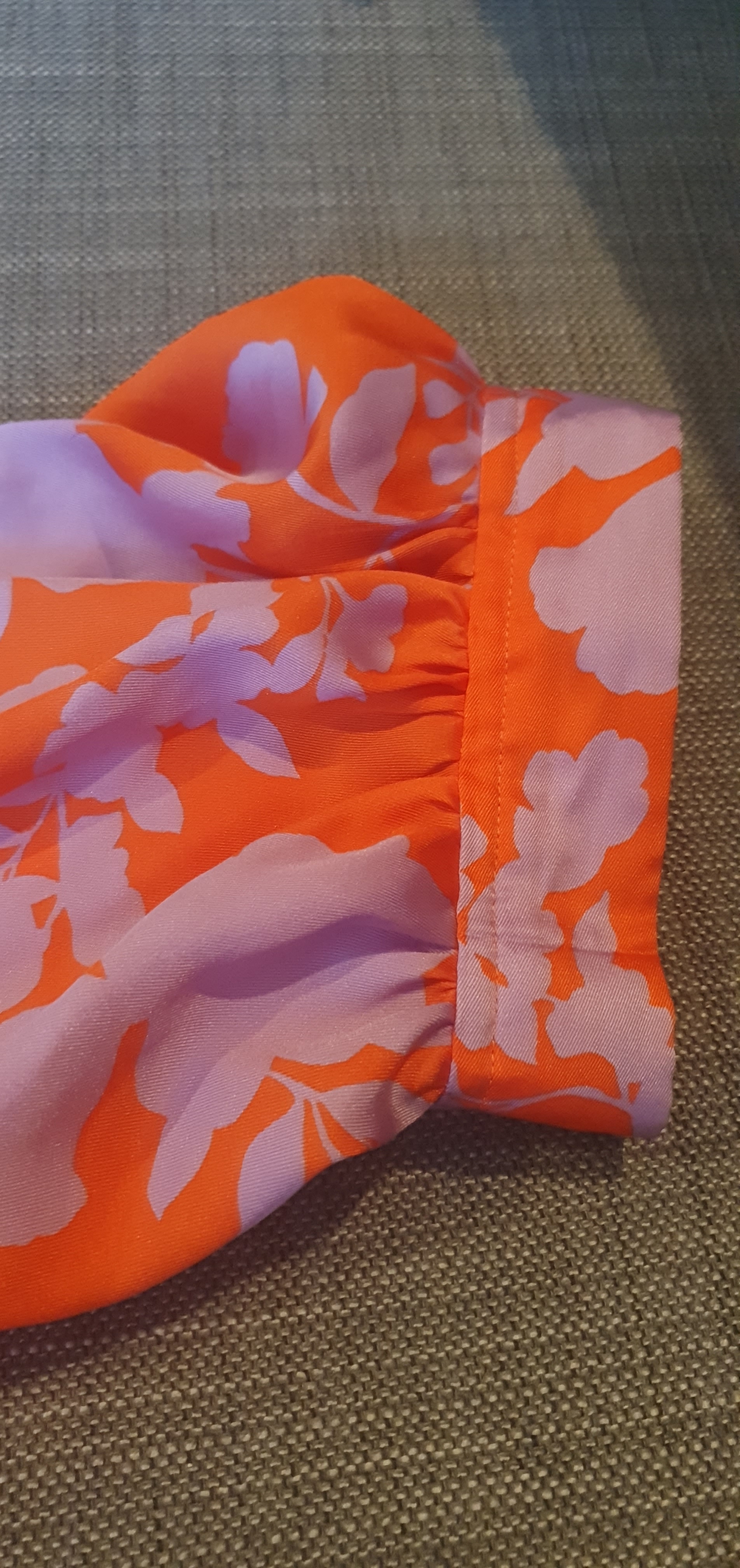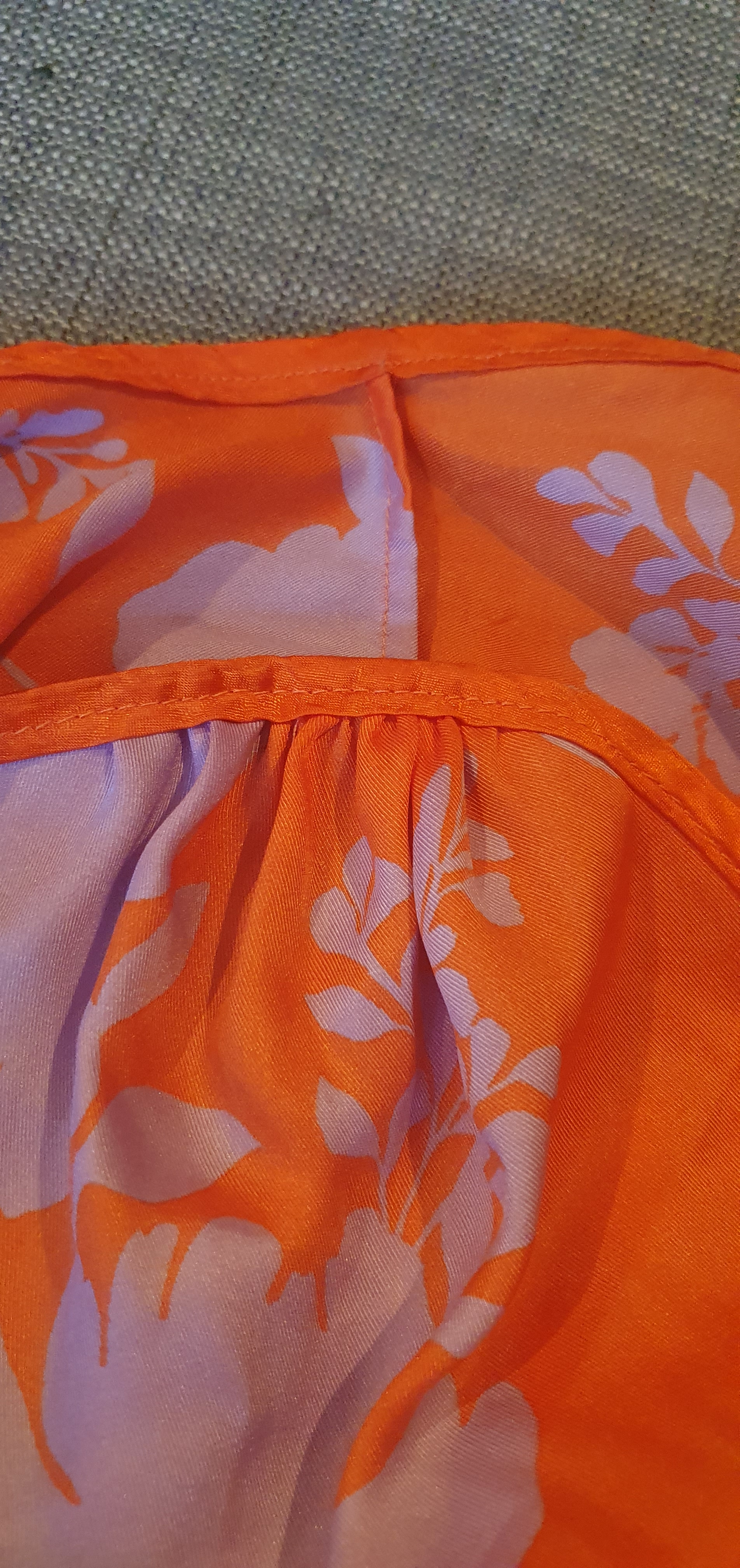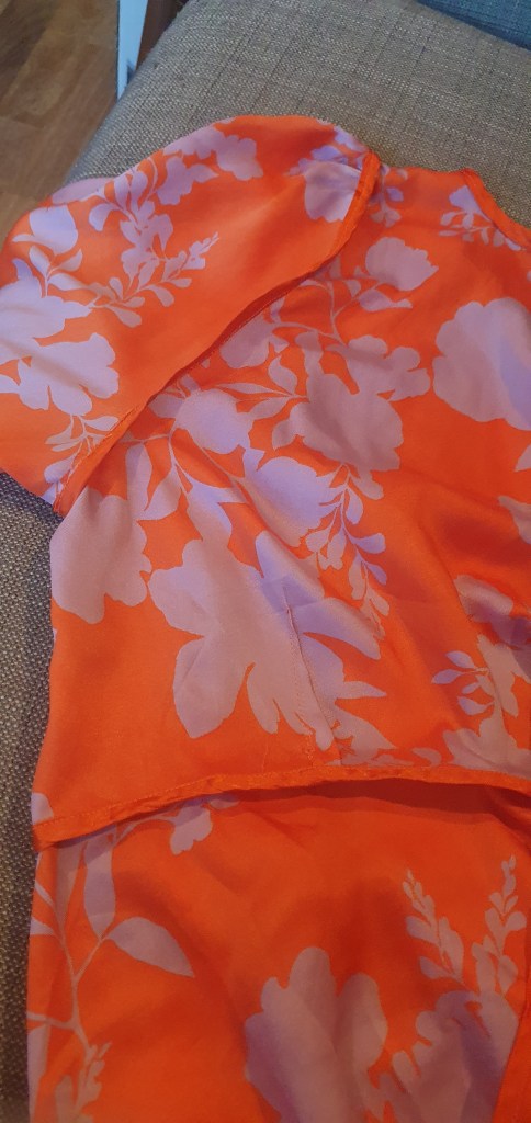 The pattern uses bias binding on the neckline and this extends into two of the ties, which is a nice touch. I originally intended to use self-fabric but was tight for time and the size of the strips in the pattern were too narrow for my bias making machine and I couldn’t be bothered to manually make the bias, so I next day-ordered some tangerine bias binding that turned out to be a great match. This did mean I’d already attached the ties in the bodice side seam in self fabric, whilst the neckline ties were in tangerine satin, but I don’t think it’s too awkward. Everything was extremely straightforward; the only change I would make to the pattern instructions would be to sew the cuff closed closer to the seam line so it’s less obvious.