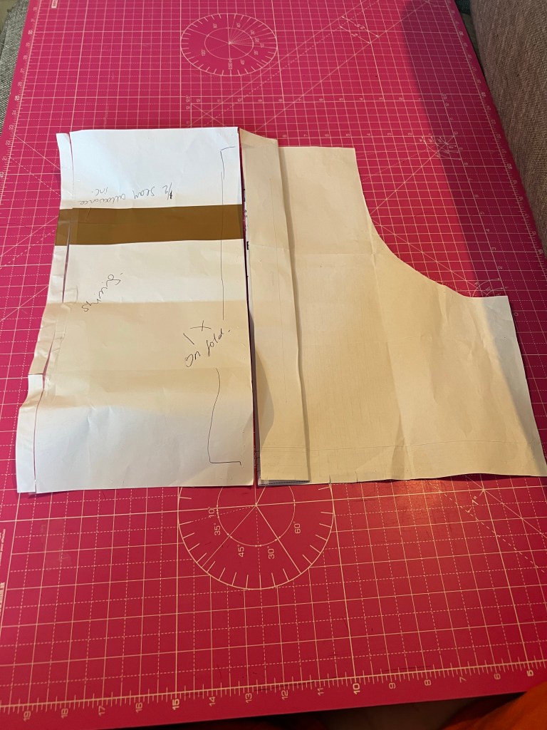 I folded out a 3” wide section from the centre back, where the zip would have gone. I then drafted the piece on the left, which is 6” plus seam allowance. It is cut on the fold, so the final width will be 13 2/8”. That piece of fabric will then be attached to both the left and right bodice pieces.