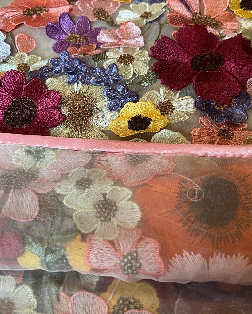 Once I’d attached the tulle pieces to the organza pieces, I then set about embellishing the tulle layer with additional flowers, as the embroidery on the tulle was more sparse than I would like. By sewing these onto both the tulle and organza layers, this had the added benefit of strengthening the underlining so that the layers didn’t separate or bag – they were thoroughly attached.