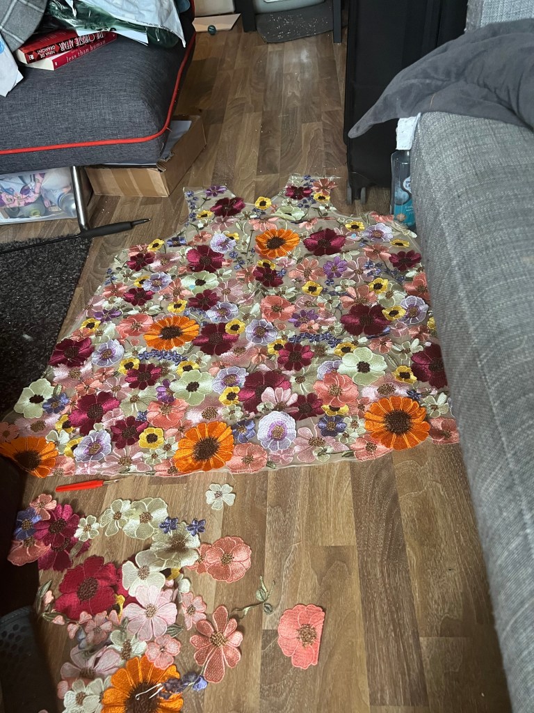 All in all, I cut the embroidered flowers out of the remaining 3 yards of tulle, and hand sewed them onto the dress using invisible thread. This was LABORIOUS! I spent about 8 hours cutting out flowers and 20 hours hand-sewing them on. I chose to add the additional flowers so that the effect was dense at the bottom of the dress, getting slightly sparser moving up (although still giving good coverage over underwear) and then had more mesh on show at the shoulder.