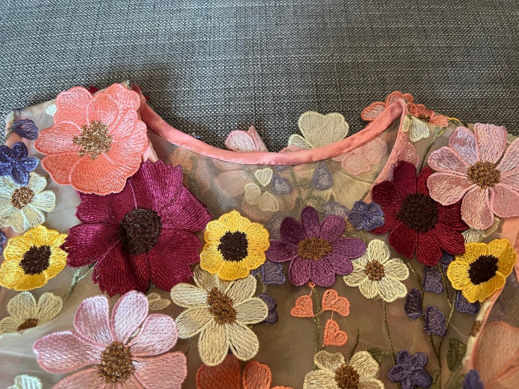 The neckline – bias faced with additional flowers to hide the facingOne of the armholes. Embroidered flowers hide the edge of the armhole. The underneath of the underlined tulle, bias faced at the hem.