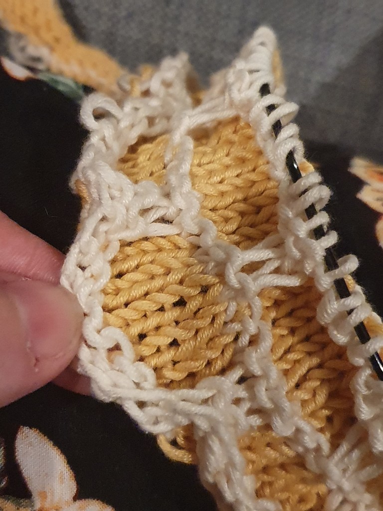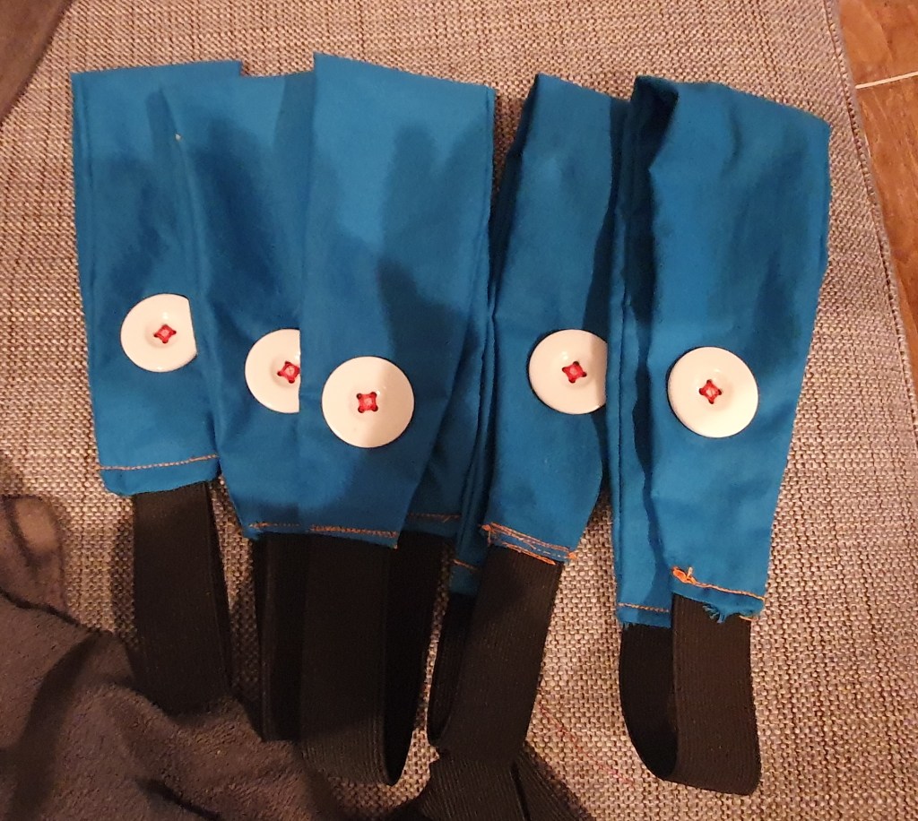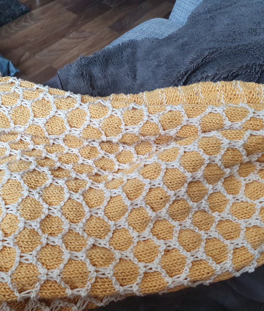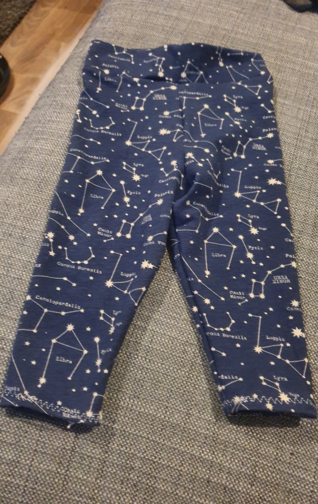 My first successful project with cables – a snoodAnother rib knit infinity scarf – my other half liked the blue one so much (which was a gift for someone else) that he requested one of his ownA simple rib knit snood in fire colours, as a birthday gift for a friend My current work in progress – a honeycomb baby blanket using the pattern at https://www.lanasyovillos.com/en/home/honeycomb-blanketClose up of the bottom edge of the blanket Button headbands made for NHS workers An initial messy attempt at face coverings for family Scrub bagsMy first ever piece of clothing – and in jersey and using my overlocker for the first time, no less – I took a slight “go hard or go home” attitude…! A pair of leggings for a friend’s baby using Pirates for Patterns petite pegs pattern.And a co-ordinating little t-shirt with lap neckline – using a Pirates for Patterns wee lap tee pattern. I had some trouble with the neckline as I thought I needed to have excess neckband left over and didn’t realise I was going to have to remove the excess anyway, so I didn’t need to bunch the neckline the way I did. And I actually hemmed the bottom twice, which led to it getting all stretched out. Live and learn!Much neater masks using the Tilly and the Buttons method – these have a pocket for a filter and a nose channel. Matching masks for me and my other half!