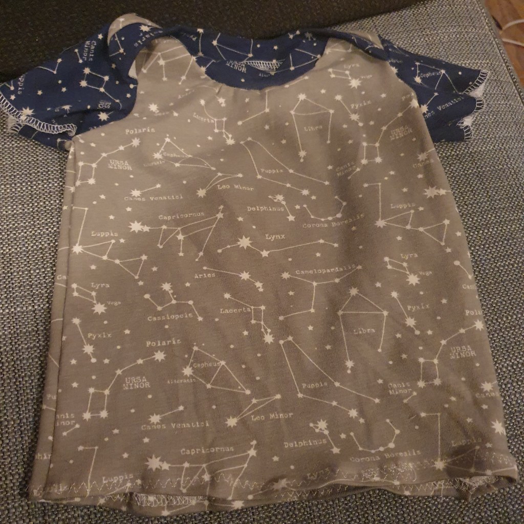 So that’s my journey so far – I have had a few mishaps that I had to chuck. The baby tee was meant to be entirely in the blue jersey, but I didn’t cut on the fold and ran out of fabric – so I used the grey to coordinate and thankfully it looks fab. I then tried to make a onesie out of the grey, which I had a nightmare with due to one of the steps in the pattern with the neckband – I’m going to remake it and use the method from the Pirates for Patterns lap tee, as that is much easier.